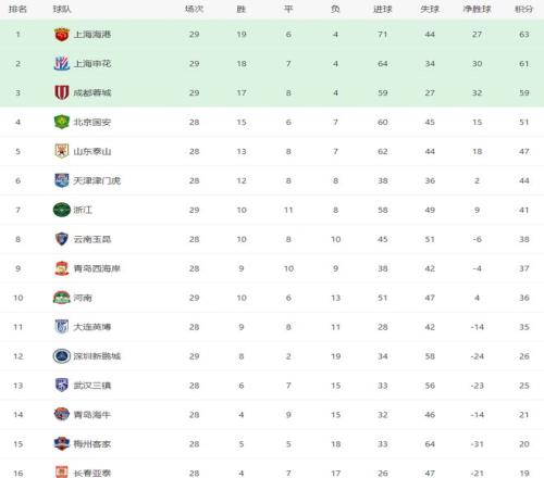 随着海港30浙江,申花10,中超最新积分榜:蓉城被逆转退出争冠
