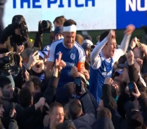 当终场哨响,奇迹正式诞生时,激动的麦克尔斯菲尔德球迷疯狂冲进场内,与球员一起激动拥抱庆祝。