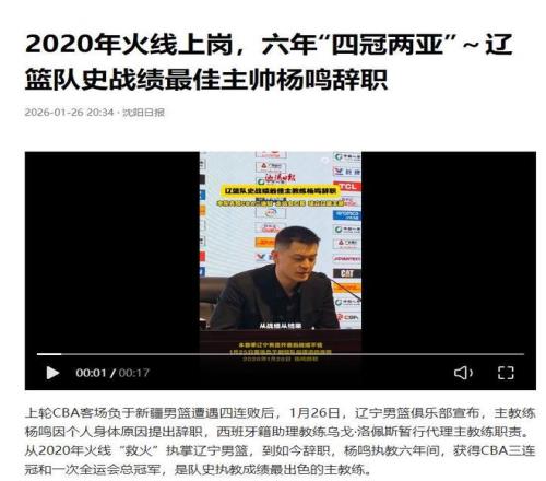 1月26日,辽宁男篮俱乐部官宣杨鸣由于身体原因辞去了主教练一职。